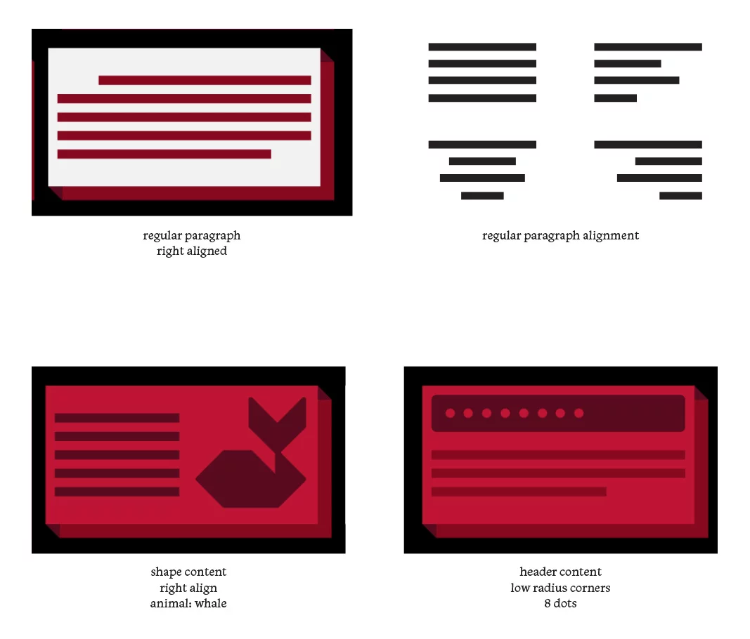 Line styles are reactive to the other elements in a given tile. For example, if a shape exists on the left or right side the lines will be justified around them. They can also be left, center or right aligned or paragraph style. The alignment effect is achieved by drawing evenly spaced lines within the constraints of the box and randomly trimming from the left, right, or both sides. The method is completely deterministic and resolution-agnostic.