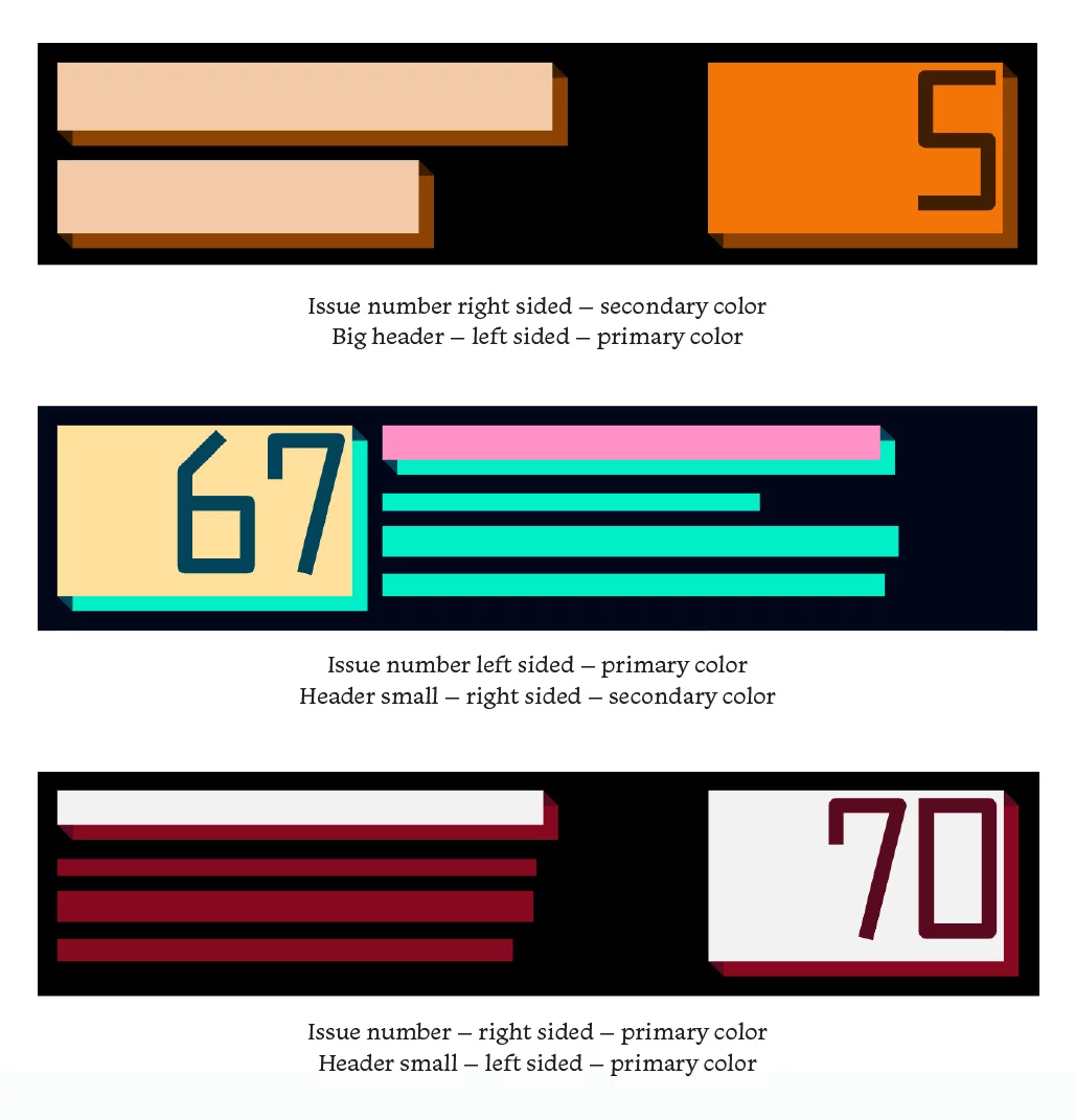 The issue number box and header can be left or right-sided.