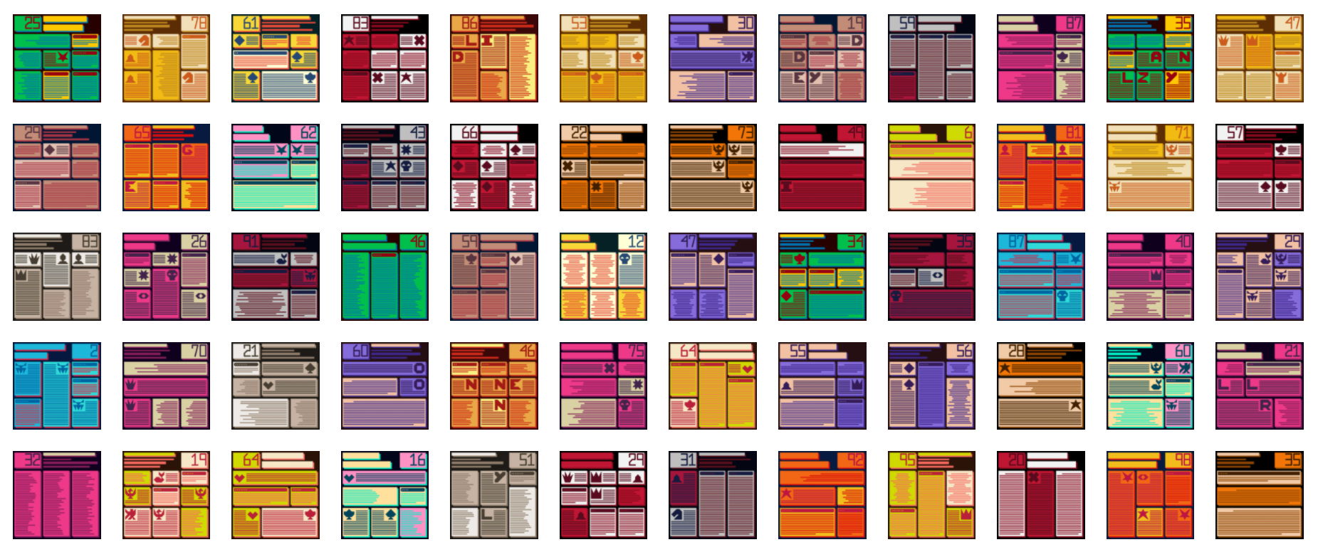 Once the tiles are organized, we make a second pass adding various elements. There are multiple header types which are generatively created and include a randomly assigned edition number. Because all of the code is stored on-chain, hard coding shapes is always a challenge. To solve this we devised a 5x5 coordinate system for drawing shapes and numbers from 25 possible vertices.