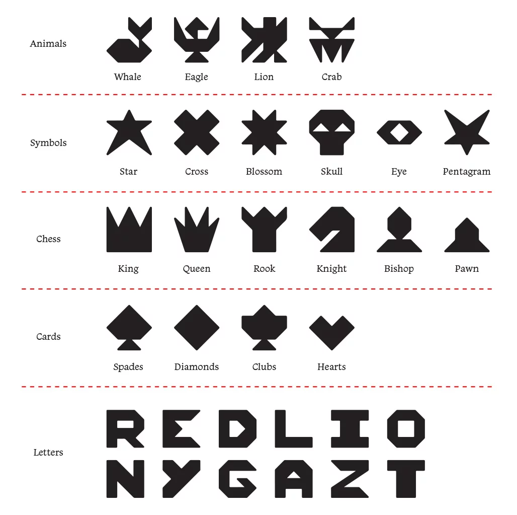 Each Gazette randomly chooses 1 group of shapes. The shapes generated will be from that group. The shape can have left or right alignment in its box.